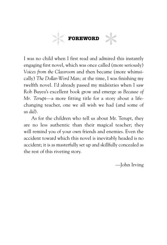 ROB BUYEA taught third and fourth graders for six years; then he taught high school biology and coached wrestling for seven years. Currently, he is a full-time writer and lives in Massachusetts with his wife and daughters. He is the author of the Perfect Score series. His first novel, Because of Mr. Terupt, was selected as an E. B. White Read Aloud Honor Book and a Cybils Honor Book. It also won seven state awards and was named to numerous state reading lists. Mr. Terupt Falls Again and Saving Mr. Terupt are companion novels to Because of Mr. Terupt. Visit him online at robbuyea.com and on Facebook, and follow @RobBuyea on Twitter.
