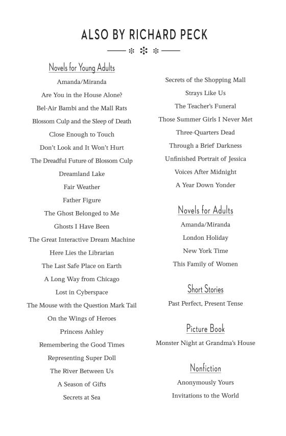 RICHARD PECK (1934-2018) was born in Decatur, Illinois and lived in New York City for nearly 50 years. The acclaimed author of 35 novels for children and young adults, he won the Newbery Medal for