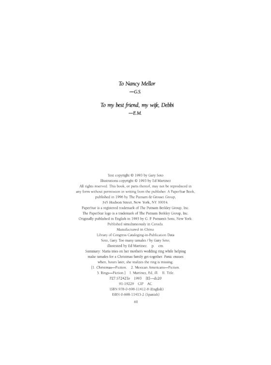 Too Many Tamales was named a Booklist Books for Youth Editors' Choices of 1993. Hazel Rochman of Booklist said, "Gary Soto is an accomplished poet and adult writer, and his children's stories are widely popular. His first entry into the picture book genre is a joyful success."