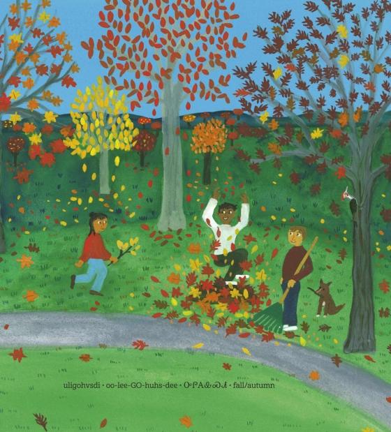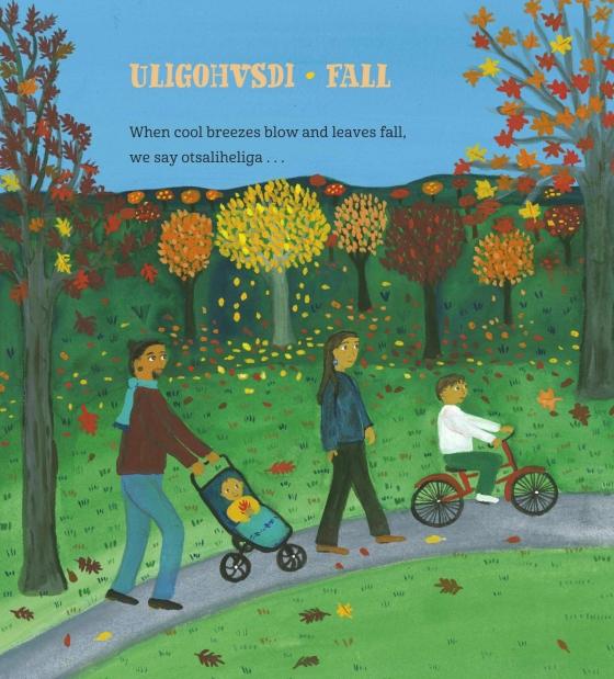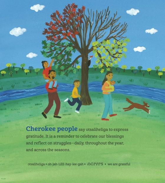 * Cherokee people say otsaliheliga to express gratitude. It is a reminder to celebrate our blessings and reflect on struggles — daily, throughout the year, and across the seasons.” An extended family engages with activities and traditions that express gratitude and carry on Cherokee history and culture, such as stomp dancing at the Great New Moon Ceremony, basket weaving, making corn-husk dolls, and playing stickball. The book underscores the importance of traditions and carrying on a Cherokee way of life while simultaneously incorporating modernity and challenging dated media images of Indigenous people. Here, a father sporting an earring and a topknot minds the children; a family bids goodbye to a clan relative who deploys with the U.S. military. Skin colors range from light to dark, visually underscoring the book’s message of diversity and inclusion. Staying firmly upbeat and idyllic, the cheerful, richly detailed gouache illustrations in bright, saturated colors cycle through the seasons, beginning with the Cherokee New Year in autumn. The text includes several Cherokee words; a line of text in a smaller font along the bottom of the page provides each word as written in the English alphabet, its phonetic pronunciation, the word as written in the Cherokee alphabet, and its definition. A glossary, an author’s note on Cherokee culture, and a complete Cherokee syllabary conclude this attractive and informative book.