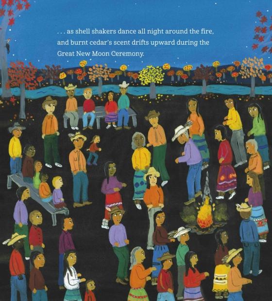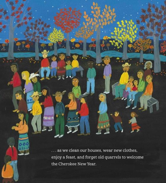 Cheerful, richly detailed folk art-style illustrations in bright, saturated colors show contemporary Cherokee life as one family participates in cermonies and festivals through each season of the year.