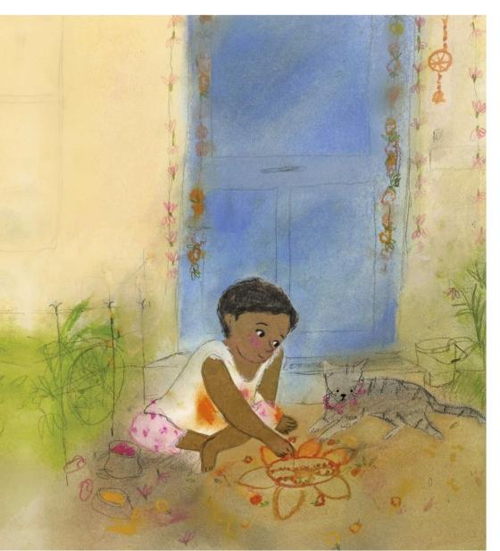 Join Ronak and his family for the Hindu festival of bright blessings in this heartwarming story of sibling love and friendship.Diwali, the Hindu festival of lights and enlightenment, is a joyous occasion. There are rangolis to draw with colorful powders and chalk, new outfits to wear, delicious sweets to eat, visits from friends and family, and fireworks that light up the night. Only one thing dims Ronak’s enjoyment: wondering if his big sister Dadi will make it home in time to share in all the rituals and special details of the evening. Once she arrives, Ronak’s heart can rejoice fully and shine brilliantly. This warm, beautifully illustrated first story in a young series about festivals ends with Diwali-themed craft activities for readers.